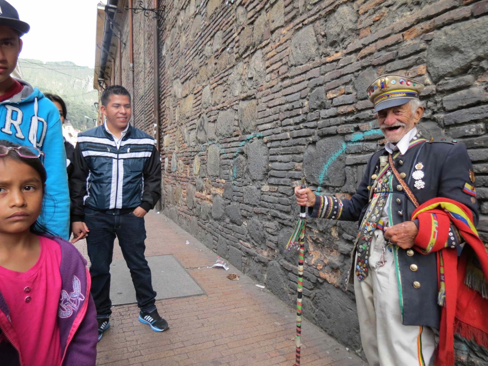 He says he's 85 and that he's been walking the streets of La Candelaria for 12 years. He was a waiter once, and then a security guard, until he got fired for being too old. Now, he survives off of a government pension and the coins which locals and tourists give him to pose for photos, make political commentaries (