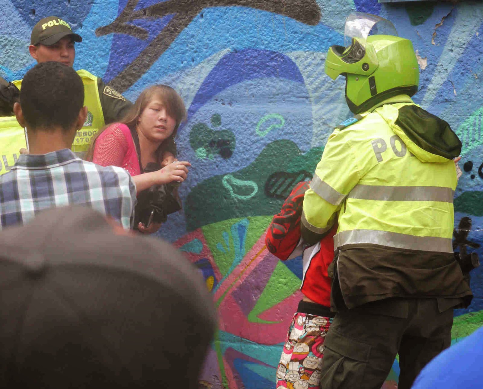 This happened on Carrera Septima the other day. But the police's motives for grabbing the youth weren't clear. One observer thot he'd stolen a bike that was nearby. Others speculated that one or both of the young women present had accused him of attacking her, and then repented.